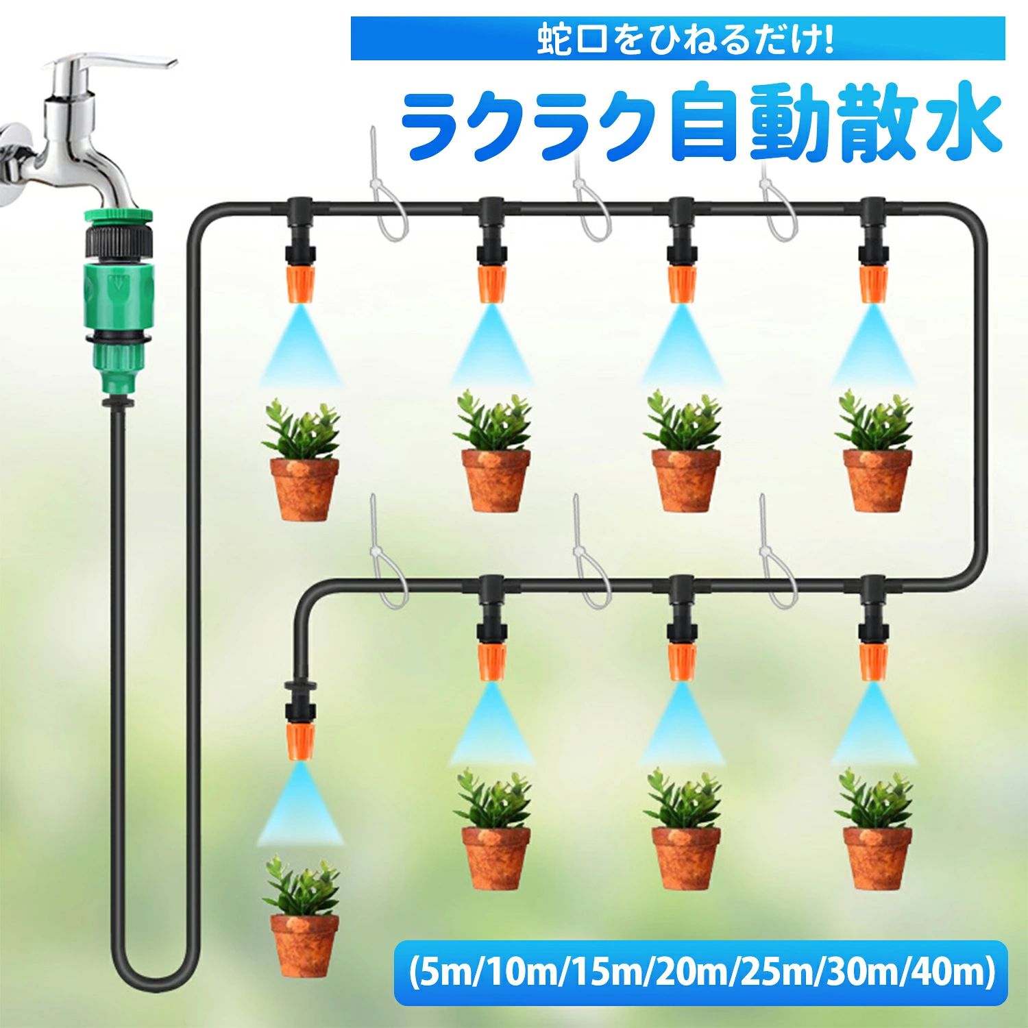 蛇口をひねるだけで20鉢同時散水!忙しい方の理想的な水やりソリューション 製品の特徴 驚異の効率化 蛇口をひねるだけで最大20鉢に同時散水可能 広い庭やベランダの水やり時間を1/10に短縮 重いジョウロを使う必要がなく、腰への負担ゼロ 超簡単設置 工具不要!ハサミでチューブを切って接続するだけ 3ステップ簡単設置:切る→差し込む→接続 自由なレイアウトが可能で、植物の配置に合わせて柔軟に対応 高品質コンポーネント 耐久性抜群のPVC灌漑用チューブ(5m〜40mオプション) リーク防止設計の平口三方ジョイント(5〜40個セット) あらゆる蛇口に対応する万能ジョイント付属 精密水流コントロール ネジ式調整で散水範囲を自由にカスタマイズ 鉢の大きさや植物の種類に合わせて水流を微調整 広範囲散水からピンポイント給水まで対応可能 マルチユース機能 付属の噴霧ノズルでミスト散水も可能 通常の蛇口として... |