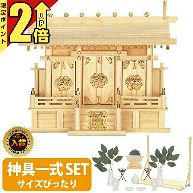 商品説明★ 初めて神棚をお祀りする方にお勧めの神棚セットです。★ 神棚、陶器製の神具、神鏡、八足台、榊造花が全てセットとなっております。★ 千木を差し込み式とし高さを抑え、やしろ内部床を床落とし式となっているため大きな紙の大きな御神札をお納めする事ができます。★ もっとも一般的なデザインの神棚です。扉を外して御神札をお収めします。スペック* 神棚外寸:39(高)-49.5(巾)-20(奥)センチ、神棚内寸:中央扉内:27(高)10.5(巾)-5.5(奥)センチ、左右内寸:22(高)-10.5(巾)- 4(奥)センチ* セット内容:神棚本体、榊立3寸2個、瓶子2寸2個、土器皿1.8寸2個、水玉1.5寸1個、神鏡1.5寸、榊造花2個、八足台1個* 使用方法:南又は、東向きに設置します。* 注意事項:木製の御神札をお収めできません... |
