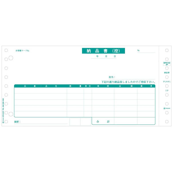 ●白色度/約80%(ISO方式)●寸法/タテ114.3×241.3mm(Y9.5×T4.5)●ミシン目切り離し後の寸法/タテ114×224mm●ファイル穴/2穴●仕様/4枚複写、ノーカーボン4P、刷り色/1枚目、2枚目、3枚目、4枚目:青緑●1枚目/納品書(控)、2枚目/請求書、3枚目/納品書、4枚目/物品受領書●長3サイズの窓つき封筒にぴったり入ります。●対応プリンタ/ドットプリンタ●単位(入数)/1箱(500セット)●メーカー品番/BP01024Pその他対応形状:連帳用途:伝票材質:特殊用紙枚数:500【送料について】北海道、沖縄、離島は送料を頂きます... |