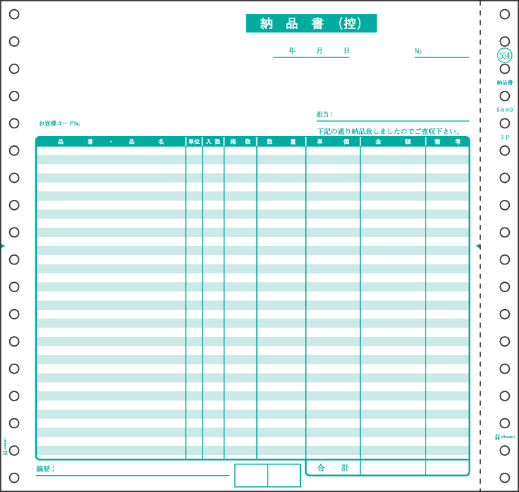 ●入数:200セット ●本体サイズ:41/2”×91/2”(縦114.3×横241.3mm)mm ●複写枚数:4枚●ミシン目切離し時サイズ:横幅88/10”(223.5mm)●対応プリンタ:ドットプリンタ●納品書(税抜) ※社名や店名、住所、電話番号、ファクスなどを記載した、名入れ帳票もお作りできます。※受領印欄には、文字が複写されないように減感材が塗ってあります(減感加工)。※各種伝票のテンプレートをヒサゴHPからダウンロードできます(無料)... |
