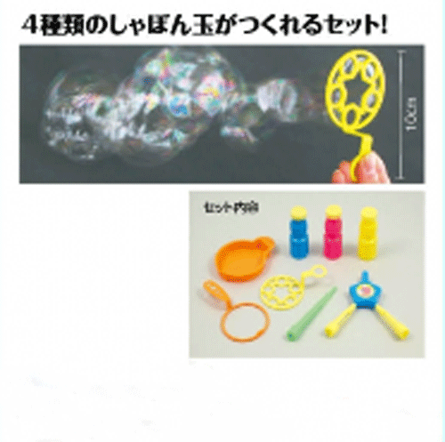 4種類のシャボン玉がつくれる スタンダードなものから大きなサイズのものなど、4種類のシャボン玉がつくれるセットです。 ●材質:吹き棒・トレイ・リングPP、容器・キャップ・ジョイントPE ●包装形態:ブリスターパック... |