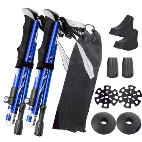 軽量アルミ製トレッキングポール 2本セット(1本あたり215g) 青 アンチショック機能付 軽量アルミ製アンチショック内蔵トレッキングポール2本セット 登山、ノルディックウォーキングに最適な アルミ製のトレッキングポールです。 軽量な7075アルミ製。 衝撃を吸収するアンチショック機能付きで、 地面の凹凸の衝撃をスプリングの伸縮によって吸収。 スプリングをステッキ中段に配置することで、手や手首に伝わる 衝撃を吸収できるように考慮した設計となっています。 グリップ部分は独特なデザインで握りやすく、 長さ調整可能なリストストラップは手首に当たる部分(内側)に クッションが付いて、長時間でも痛くなりにくい仕様です。 日本人の身長を基準とした全長で、収納時の約63cmから 最長約130cmまで、お好みの長さに伸縮できます。 長さ調整しやすい目盛り付き。 装着済みのゴムキャップの他に、予備のゴムキャ... |