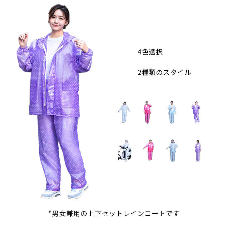 商品仕様 耐久性の高いPVC素材を標準採用しています。PVC素材を使用しており、美しさだけでなく品質も保証します。高い防水性・撥水性を持つ生地を使用しており、優れた防水・透湿機能と快適な着用感を追求しています。 大きい帽子なので、飛沫防止、風・雨・雪よけに。また、ロープ付きのレインウェア、フードのサイズを調節することができて、雨水の浸入を防ぐこともできます。上着のにはポケットあり、小物の収納に便利です。 袖口をゴム素材を採用された。調節可能な伸縮性のある袖口仕様濡れにくいです。反射シート付き-夜間などの視界の悪い雨の日や暗い場所での安 全性を強化します。 便利なデザインで、様々な場合に適用します。通勤・通学・自転車・バイクなどの日常使いはもちろん、キャンプや釣り、ハイキングなどのアウトドアまで幅広くご使用いただけます。梅雨シーズンの豪雨・台風対策などでも活躍間違いなしです!シーンやシューズ... |
