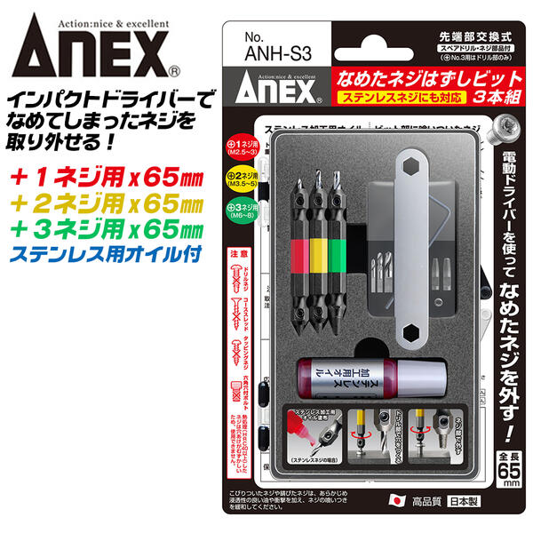 商品情報 メーカー 兼古製作所品番 ANH-S3仕様・スペック 【セット内容】M2.5〜3ネジ対応ビット(全長65mm)M3.5〜5ネジ対応ビット(全長65mm)M6〜8ネジ対応ビット(全長65mm)ステンレス加工用オイルスペアドリル部品 1.5、2.0、3.0mm(各1ヶ)スペアネジ部品 No.1、No.2用(各1ヶ)専用レンチ専用スパナ固定用ネジ(各1ヶ)■電動ドライバーを使用してなめたネジを外します■スペアドリル部品、スペアネジ部品付※HRC40以上の熱処理をした穴あけが難しいため、使用できません。サイズバリエーション【通常タイプ】+1ネジ対応 65mm M2.5~M3(ANH-165)+2ネジ対応 65mm M3.5~M5(ANH-265)+2ネジ対応 85mm M3.5~M5(ANH-285)+3ネジ対応 65mm M6~M8(ANH-365)【段付き細軸タイプ】+1・+2・+3... |