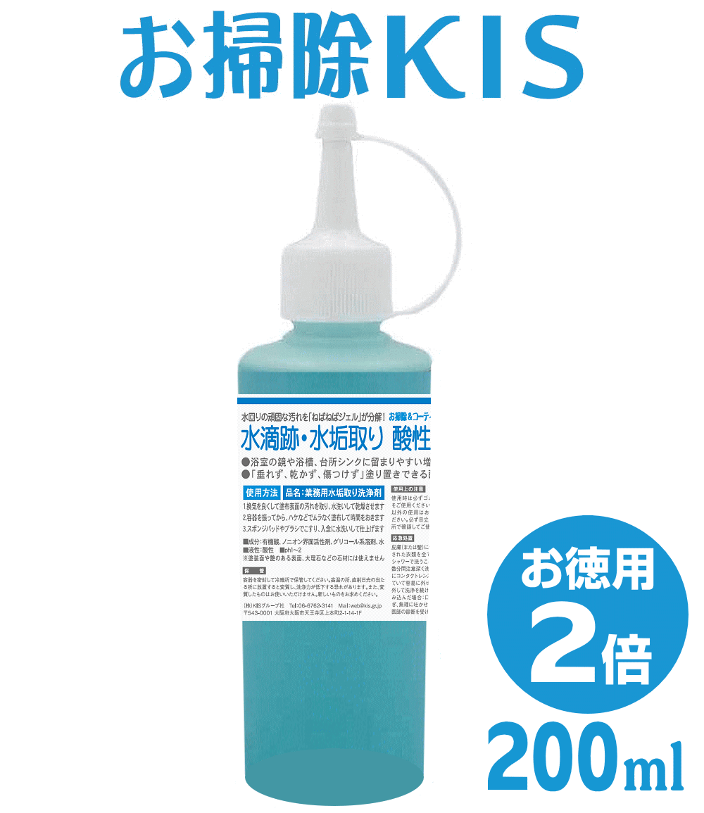 垂れず,乾かず,傷つけない水アカ用洗剤はお任せ♪ 「垂れず・乾かず・傷つけず」に塗り置きで水垢を溶かして除去するジェル状タイプの酸性洗剤。トロリと粘り気のあるジェルが壁面にも留まって洗剤成分を浸透。特に傷をつけたくない新築や新居の水周り(キッチン・浴室・トイレ・洗面台)掃除や加湿器・除湿機に付着したカルキ取りに最適です。湯垢で汚れた浴室内の小物洗いにも効果的。送料無料&即納でお届けします! サイズ・内容量 200ml(成分:クエン酸、リン酸、水、非イオン界面活性剤、グリコール系溶剤)液性:酸性 備 考 「物だけでない安心を。」プロのお掃除やさん直伝&書き下ろしの専用説明書付です♪ スマホで 買い物♪ QRコー... |