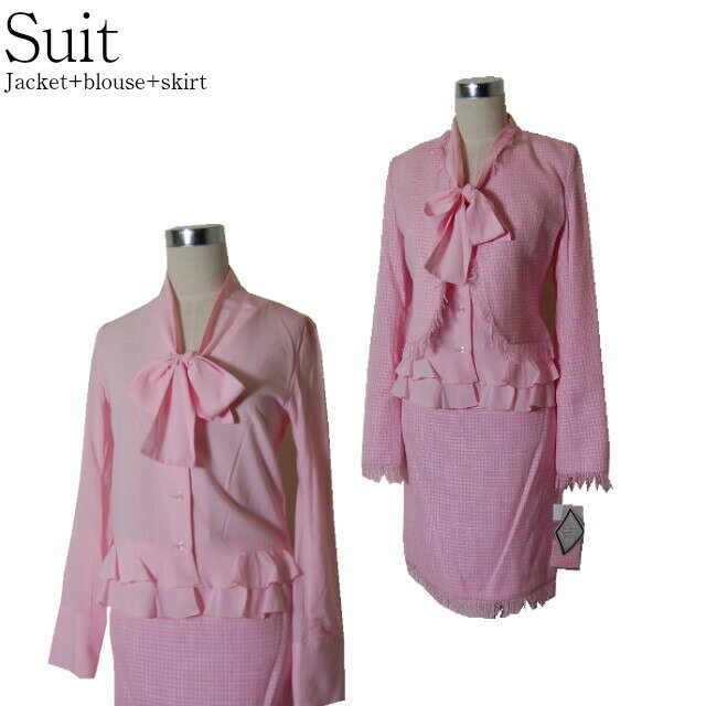 ■商品説明 ジャケット、ブラウス、スカートの3点セットアップスーツです。 綺麗系細身スカートスーツです。 商品が縫製されてから時間が経過した見切り商品です。 プレゼントではなくご自分の着用品としてご検討ください。 お安くしてあります。B品扱いで返品なしでお願いいたします。 ジャケットは1ホックボタンで、衿周りから裾まで、そで口がフリンジ使いです。 前身頃のみ裏地付き、肩パット付きです。 画像にはうつっていませんがジャケット同素材の3.5x139cmの共布ベルトが付属しています。 ブラウスはジャケットよりやや長さが長く、すそに2段フリル、前4つボタン、ボー付きです。 リボン結びしているボーは首後ろがえりとつながっています。 スカートは左ファスナー、すそフリンジ使いのタイトライン、総裏地です。 ■素材 ポリエステル100% 裏地ポリエステル インナーポリウレタン100% *薄手素材、春秋向け ... |